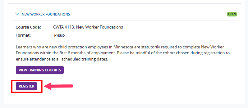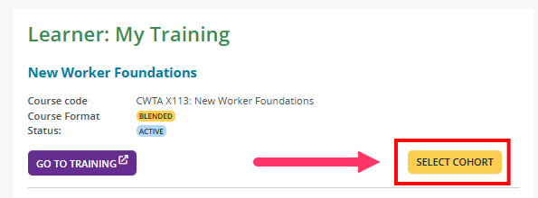 After registering for New Worker Foundations, you will need to select your cohort through your portal. Watch the video or follow the steps below.
