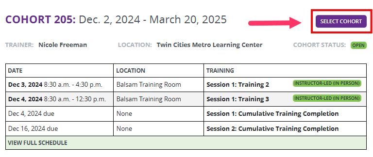Once registered, navigate back to your training portal and select "Select Cohort" to view all the cohorts available.