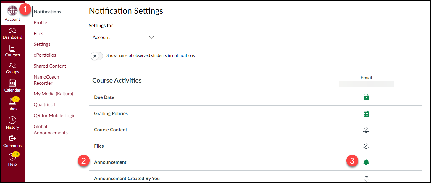 - In the email column, click on the checkmark to select "notify me right away" via email.